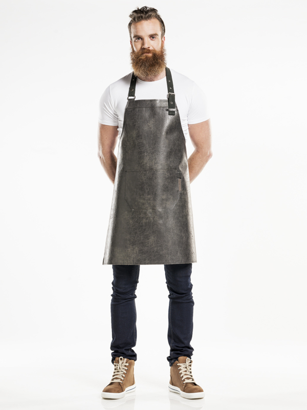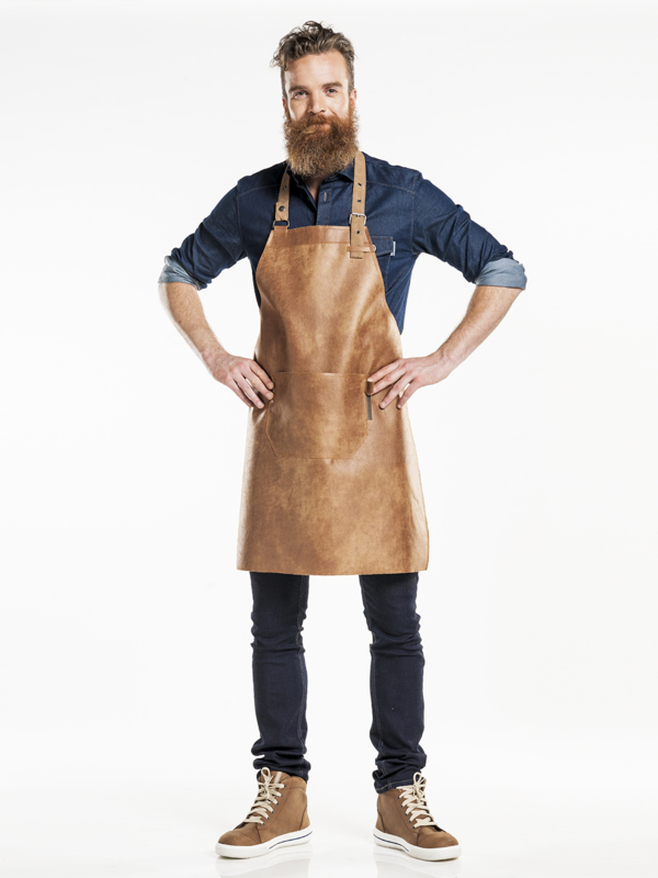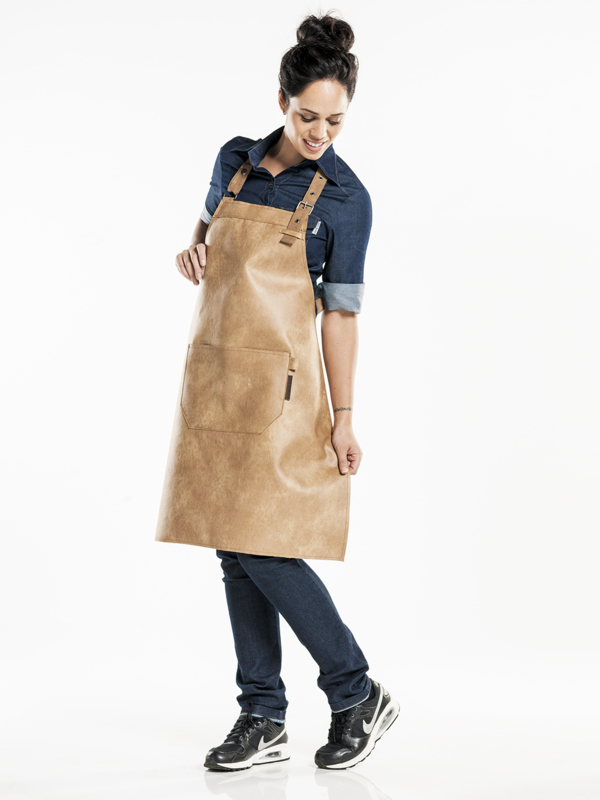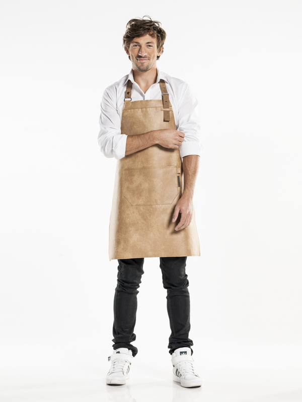 OverviewAuthentic, lightweight and timeless. From bistro to food truck or trendy bar, the new Leather70 collection fits in anywhere. The innovative combination of cowhide and polyester makes the leather bib and waist aprons lightweight and less vulnerable to stains. All of the apron ties are fully adjustable. The 'raw edge - single stitch' finish gives the collection its recognizable, tough appearance. The Leather70 collection comes in four attractive colours: Irish Cream, Bourbon Gold, Barrel Brown, and Moonshine Black. Cleaning instructions: This natural product can be cleaned with a damp cloth or a neutral soap, such as a green soap. The ties can be cleaned separately at 30°C. The best of the best in bib aprons. With its authentic look, the Regular is the all-round bib apron. This model is equipped with a handy pocket.