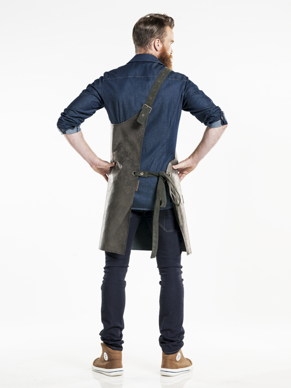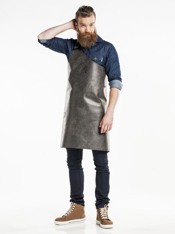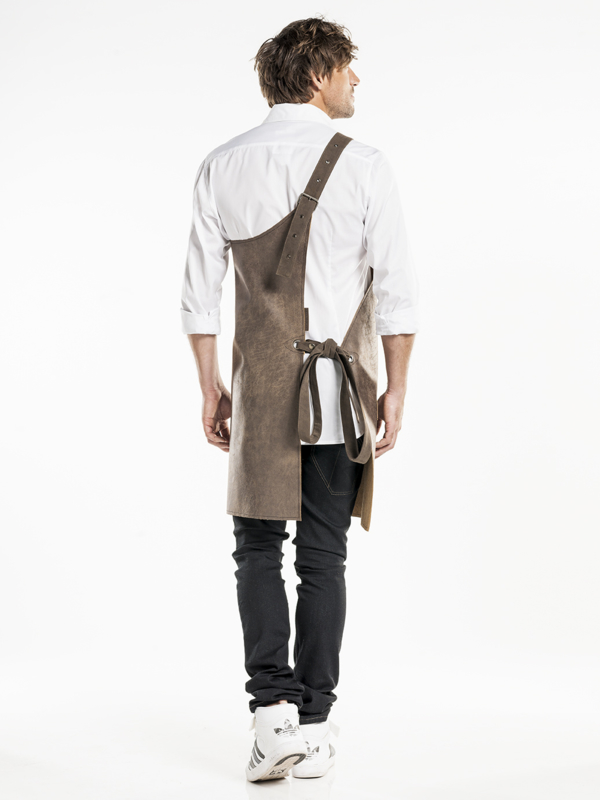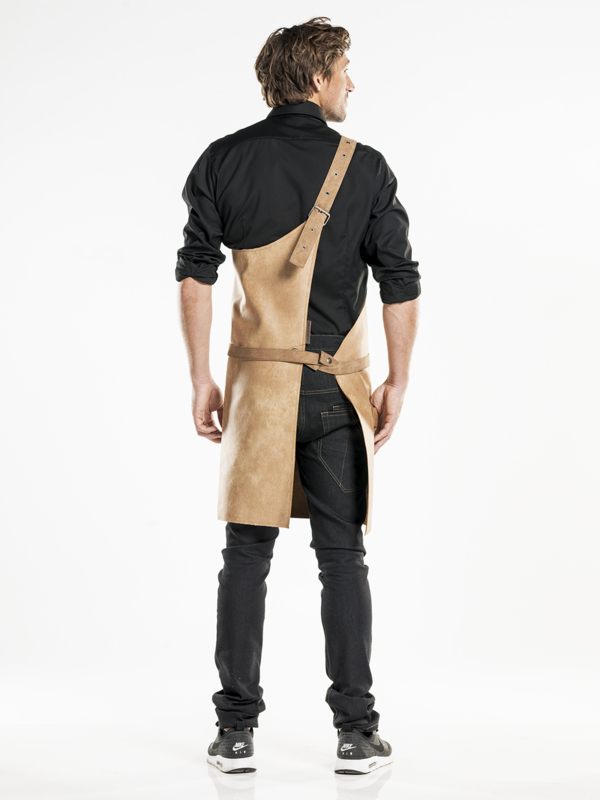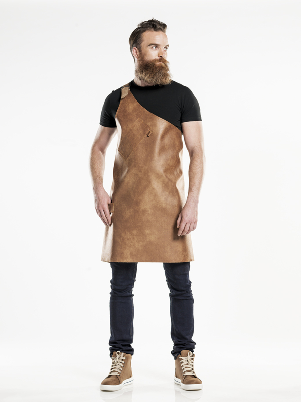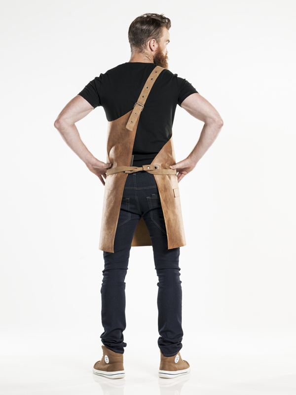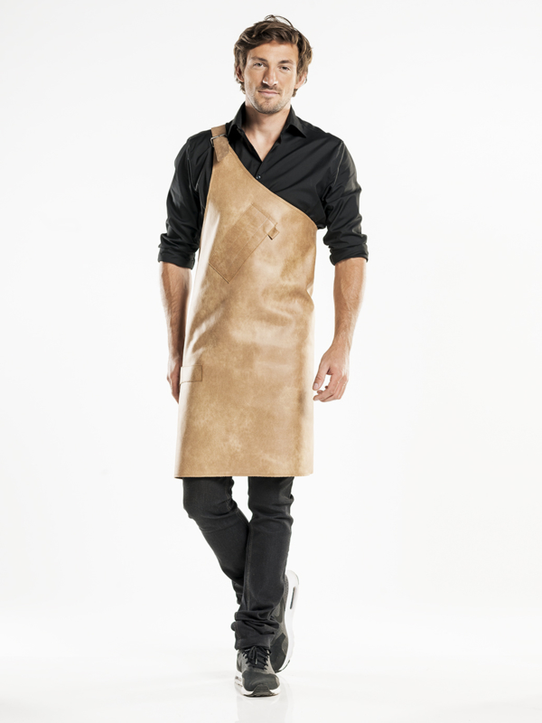 OverviewAuthentic, lightweight and timeless. From bistro to food truck or trendy bar, the new Leather70 collection fits in anywhere. The innovative combination of cowhide and polyester makes the leather bib and waist aprons lightweight and less vulnerable to stains. All of the apron ties are fully adjustable. The 'raw edge - single stitch' finish gives the collection its recognizable, tough appearance. The Leather70 collection comes in four attractive colours: Irish Cream, Bourbon Gold, Barrel Brown, and Moonshine Black. Cleaning instructions: This natural product can be cleaned with a damp cloth or a neutral soap, such as a green soap. The ties can be cleaned separately at 30°C. The asymmetric Butcher radiates craftsmanship and is a real eye catcher. Unique pockets and a loop for small tools give this bib apron a rugged look, without making concessions in quality or convenience. This model has minimal neck pressure for maximum comfort.
